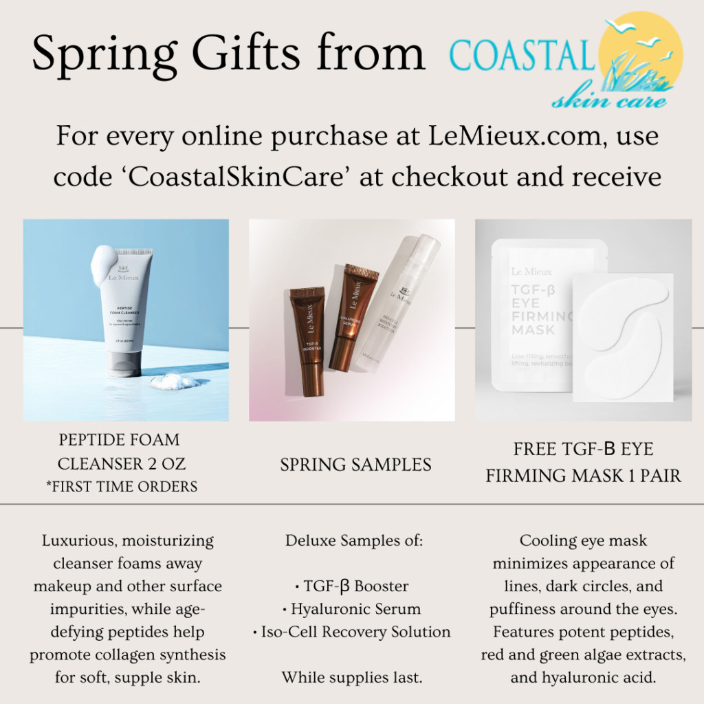 All of your favorite Le Mieux products are available for purchase online! The most important step in your skin care routine is consistency, so make sure you have everything you need at home in between your facials! Don’t forget to add our code “CoastalSkinCare” at checkout for additional free gifts with every order!!